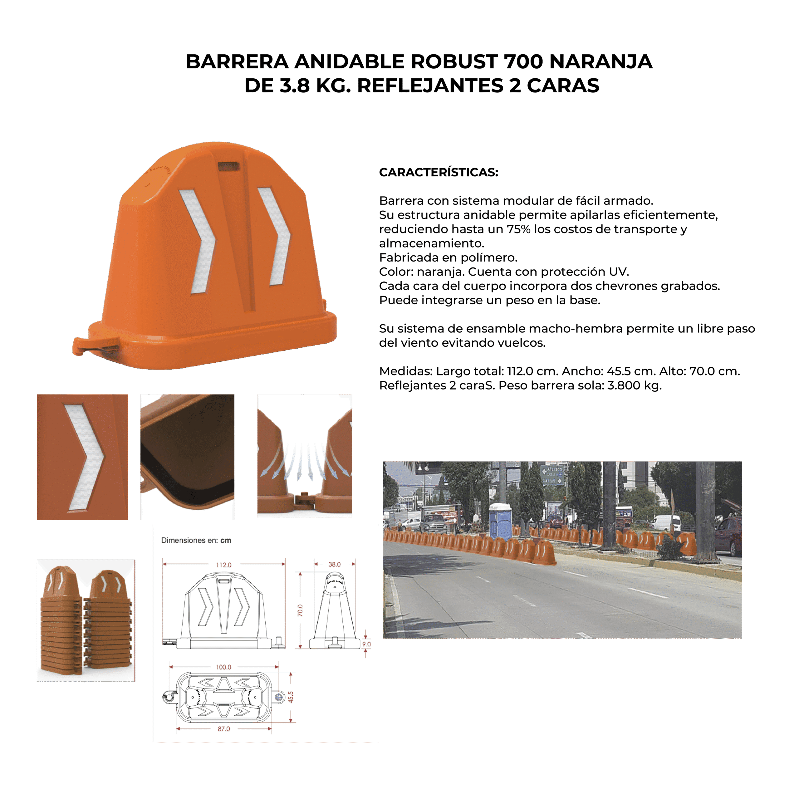 Descripción: Barrera con sistema modular de fácil armado. Su estructura anidable permite apilarlas eficientemente, reduciendo hasta un 75% los costos de transporte y almacenamiento. Fabricada en polímero. Color: naranja. Cuenta con protección UV. Cada cara del cuerpo incorpora dos chevrones grabados. Puede integrarse un peso en la base. Su sistema de ensamble macho-hembra permite un libre paso del viento evitando vuelcos. Medidas: Largo total: 112.0 cm. Ancho: 45.5 cm. Alto: 70.0 cm. Reflejantes 2 caras. Peso barrera sola: 3.800 kg.