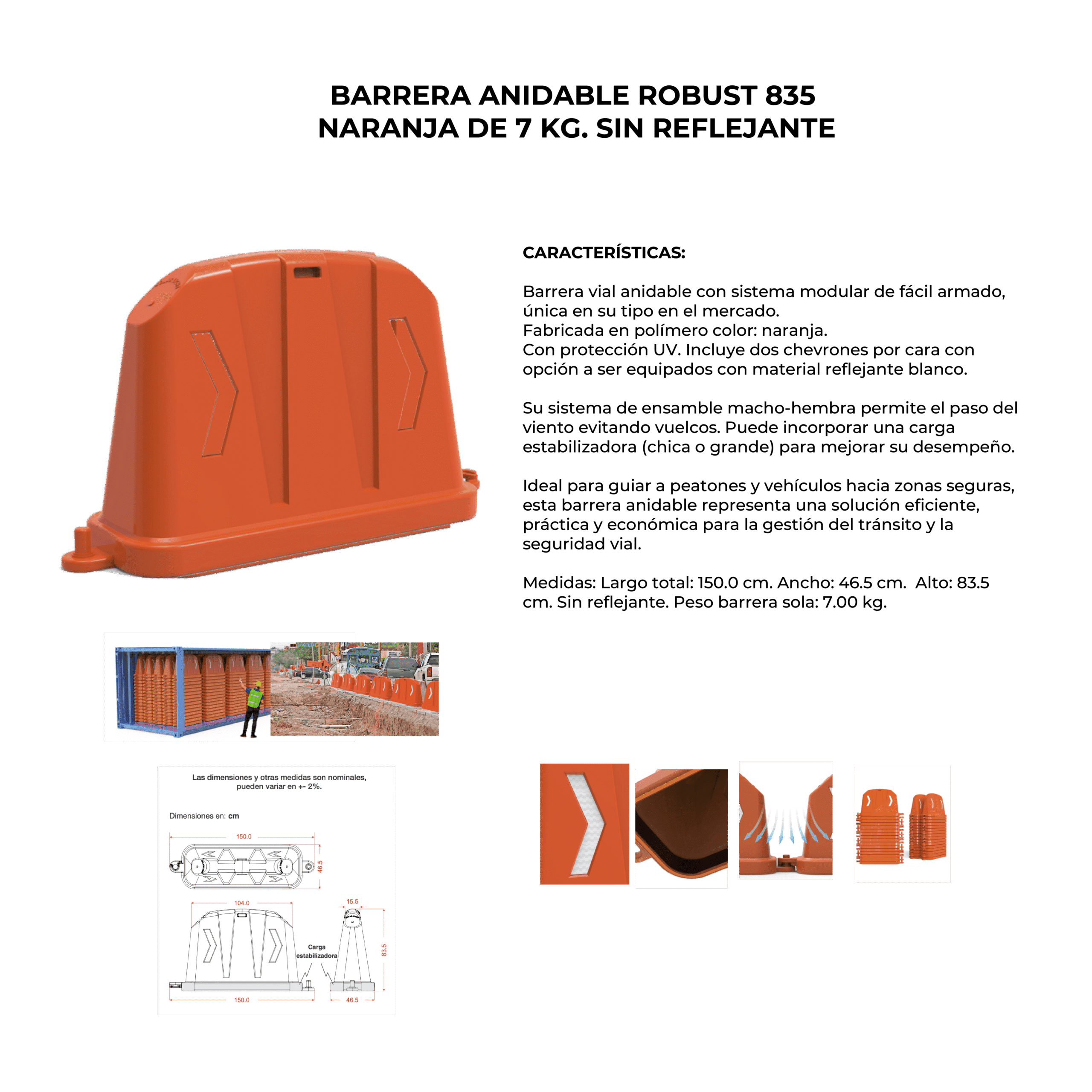 Descripción: Barrera vial anidable con sistema modular de fácil armado, única en su tipo en el mercado. Fabricada en polímero color: naranja. Con protección UV. Incluye dos chevrones por cara con opción a ser equipados con material reflejante blanco. Su sistema de ensamble macho-hembra permite el paso del viento evitando vuelcos. Puede incorporar una carga estabilizadora (chica o grande) para mejorar su desempeño. Ideal para guiar a peatones y vehículos hacia zonas seguras, esta barrera anidable representa una solución eficiente, práctica y económica para la gestión del tránsito y la seguridad vial. Medidas: Largo total: 150.0 cm. Ancho: 46.5 cm. Alto: 83.5 cm. Sin reflejante. Peso barrera sola: 7.00 kg.