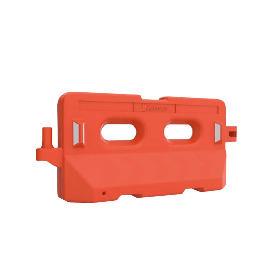 Descripción: Barrera de protección vial, fabricada en polietileno altamente resistente. Color: Naranja. Medidas: Largo: 150 cm. Alto: 70 cm. para usar vacía o con lastre, ensamble fácil y rápido. Sin reflejante.