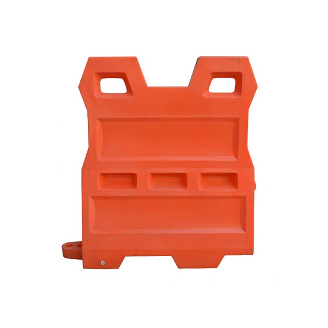 Descripción: Barrera de protección vial fabricada en polietileno de media densidad. Barrera continua con sistema de ensamble, machihembrado y protección contra rayos U.V. Color: Naranja. Medidas: Largo: 120 cm. Ancho superior: 10 cm. Ancho inferior: 45 cm. Alto: 145 cm. para usar vacía o con lastre. Sin reflejante.