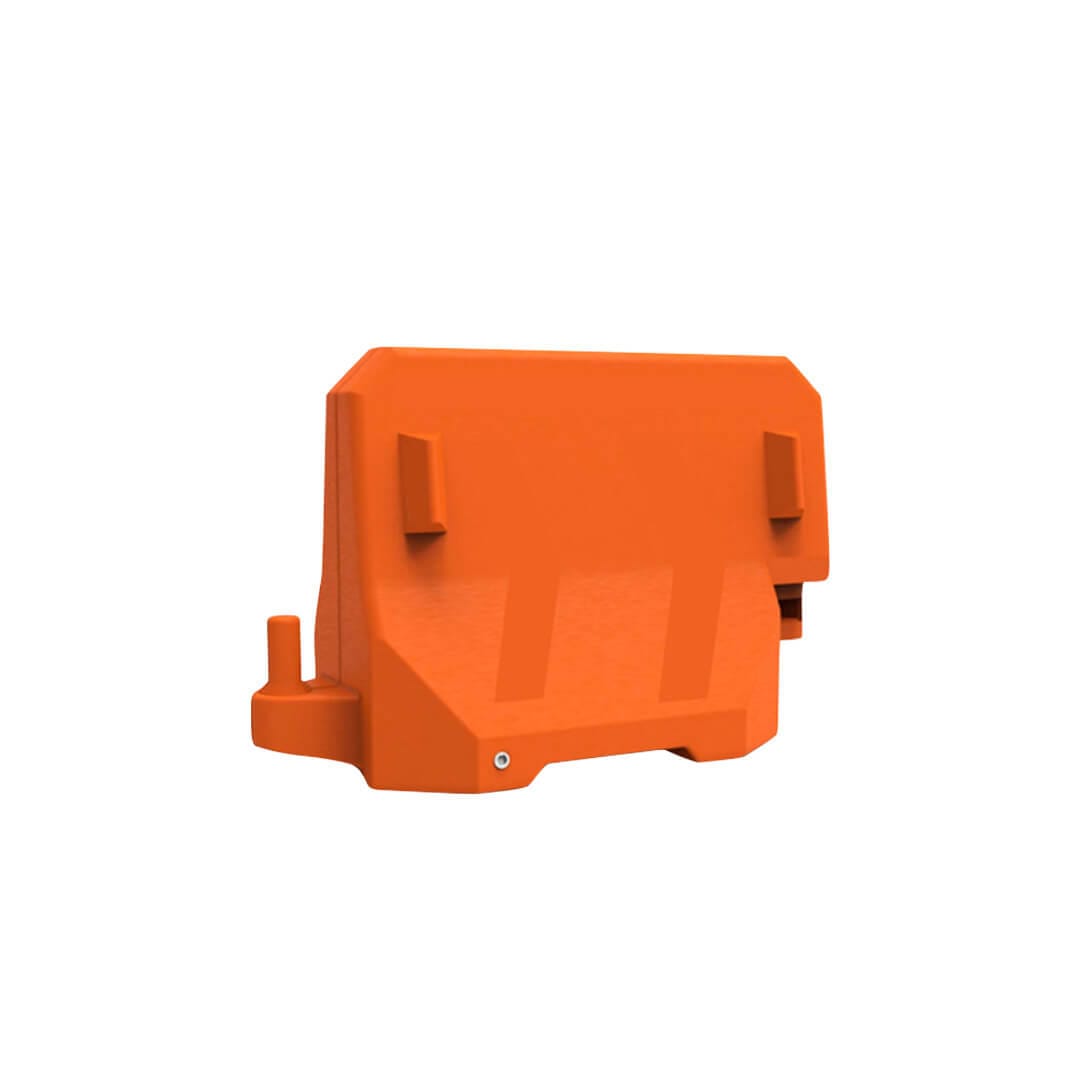 Barrera de protección vial - soplada, fabricada en polietileno. Color naranja. Medidas: Largo: 100 cm. Ancho: 50 cm. Alto: 78 cm. para usar vacía o con lastre ensamble fácil y rápido. Sin reflejante.
