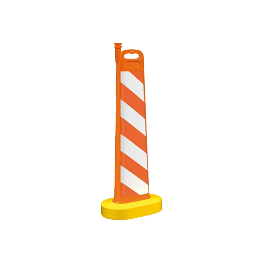 Apilable. De alta visibilidad. Medidas cuerpo: Alto: 110.0 cm. Largo: 30.5 cm. Ancho: 16.0 cm. Cuerpo: Naranja. Base: Amarilla. Con textos se cotizará por separado. Tipo oval con una cara reflejante prismático.