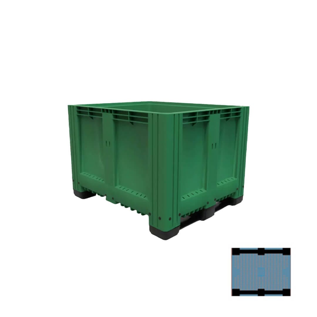 Polietileno de alta densidad, resistencia máxima ante agentes acidos, basicos y alcalinos. U.V. estabilizado, 100% reciclable. Sin superficies cortantes, seguros al apilarse. Grado alimenticio aprobado por la FDA, el BIN cerrado. Dimensiones: Largo: 120 cm. Ancho: 100 cm. Alto: 76 cm. 2 Traversas. Color: Verde.