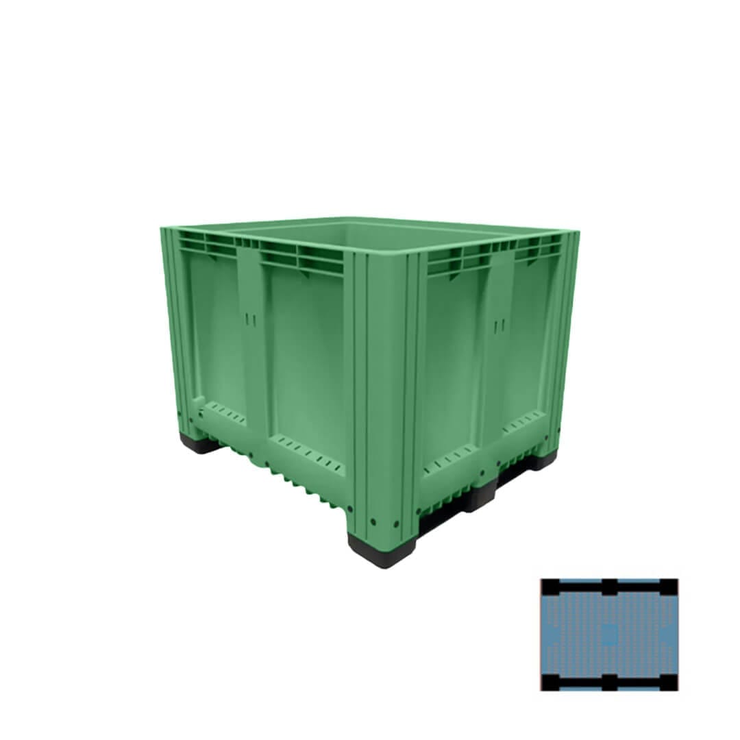 Descripción: Polietileno de alta densidad, resistencia máxima ante agentes acidos, basicos y alcalinos. U.V. estabilizado, 100% reciclable. Sin superficies cortantes, seguros al apilarse. Grado alimenticio aprobado por la FDA, el BIN cerrado. Dimensiones: Largo: 120 cm Ancho: 100 cm Alto: 82.5 cm 2 Traversas.Color: Verde.