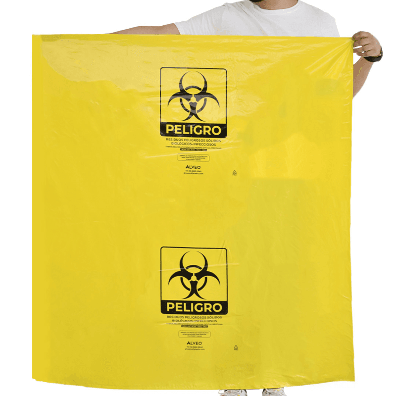 Descripción: Bolsa de polietileno de baja densidad, libre de metales pesados para la recolección de residuos biológico infecciosos. Carga Máxima: 31 kg. Impresa a una tinta con logotipo de biológico infeccioso. Con fuelles. Calibre 300. Medidas: Ancho: 110.0 cm. Alto: 120.0 cm. Color: Amarillo.