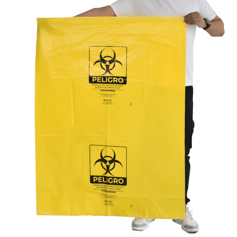Bolsa de polietileno de baja densidad, libre de metales pesados para la recolección de residuos biológico infecciosos. Carga Máxima: 28 kg. Impresa a una tinta con logotipo de biológico infeccioso. Con fuelles. Calibre 300. Medidas: Ancho: 90.0 cm. Alto: 120.0 cm. Color: Amarillo.