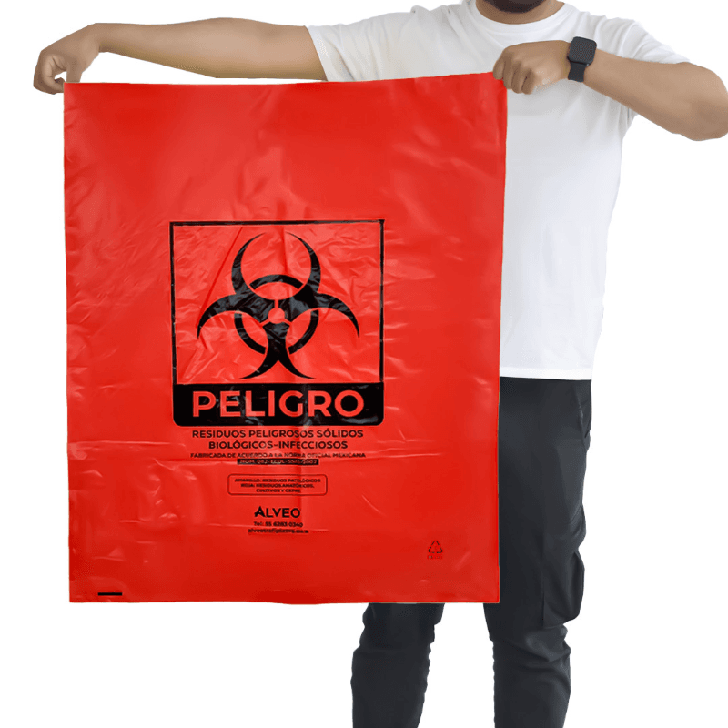 Descripción: Bolsa de polietileno de baja densidad, libre de metales pesados para la recolección de residuos biológico infecciosos. Carga Máxima: 21 kg. Impresa a una tinta con logotipo de biológico infeccioso. Con fuelles. Calibre 300. Medidas: Ancho: 70.0 cm. Alto: 90.0 cm. Color: Rojo.