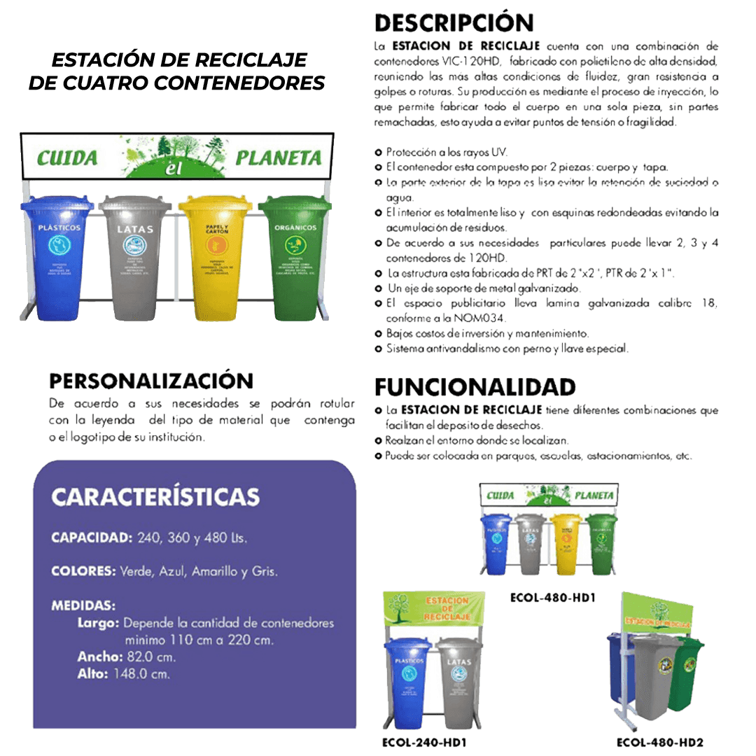 Descripción: Capacidad por contenedor: 120 lts Color del contendor: Verde, gris, amarillo, y azul. Medidas contenedor: Largo: 47.0 cm. Ancho: 54.0 cm. Alto: 94.0 cm. Color soporte: Gris Claro. Medidas estación: Largo: 110.0 cm. Ancho: 96.0 cm. Alto: 148.0 cm. Capacidad total de reciclaje: 480 lts. Espacio publicitario con una cara al frente. Espacio publicitario: Largo 220.0 cm. Alto 40.0 cm. Costo de personalización de logos y leyendas en vinil impresión Digital y vinil en contenedores de acuerdo a proyecto no incluido.