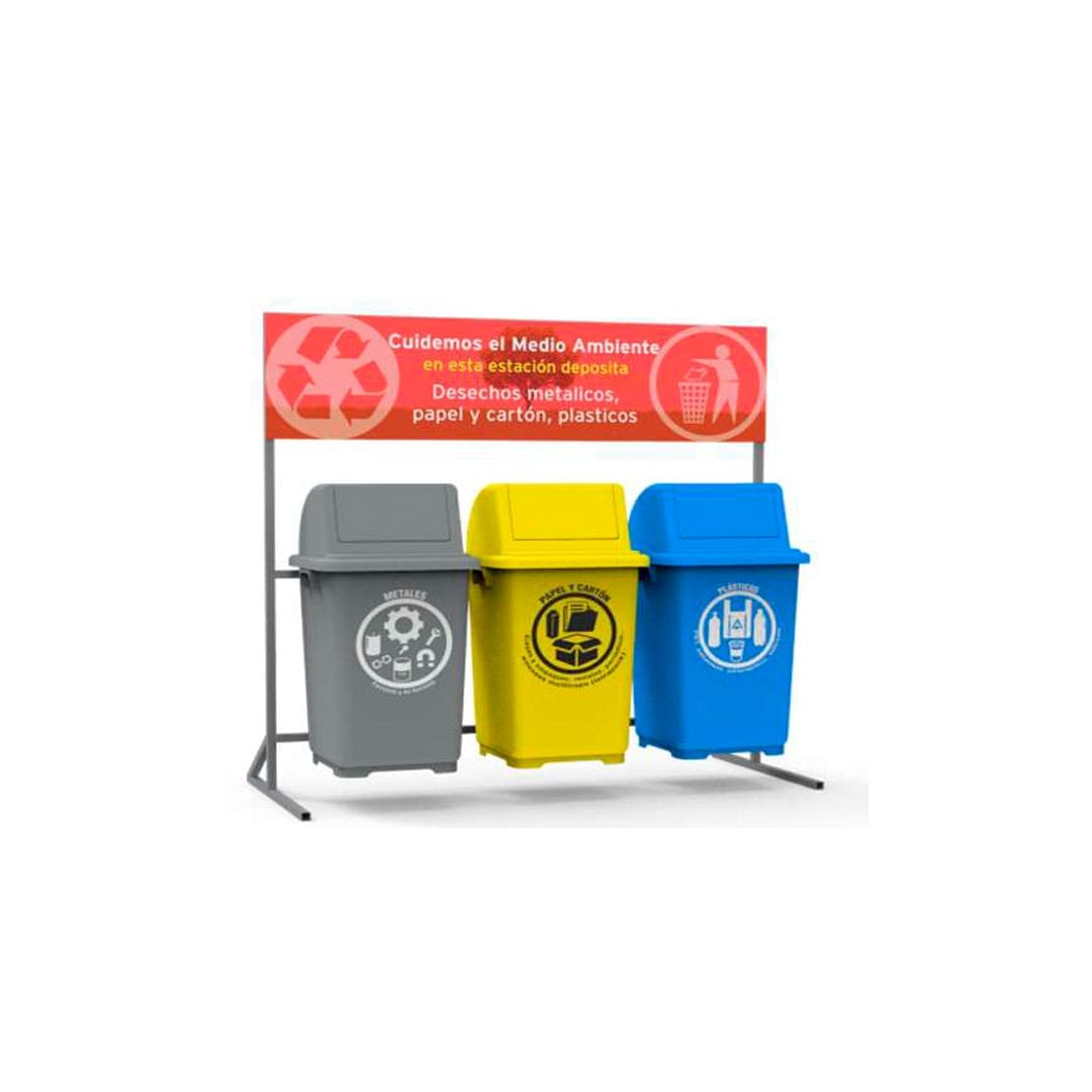 Descripción: Capacidad por contenedor: 90 lts. Color: verde, gris, amarillo y azul. Medidas del contenedor: Largo: 47.0 cm. Ancho: 54.0 cm. Alto: 94.0 cm. Color de soporte: Verde. Medidas estación: Largo: 165.0 cm. Ancho: 78.0 cm. Alto: 148.0 cm. Capacidad total de reciclaje: 270 lts. Espacio publicitario con una cara al frente. Costo de personalización de logos y leyendas en vinil impresión Digital y vinil en contenedores de acuerdo a proyecto no incluido.