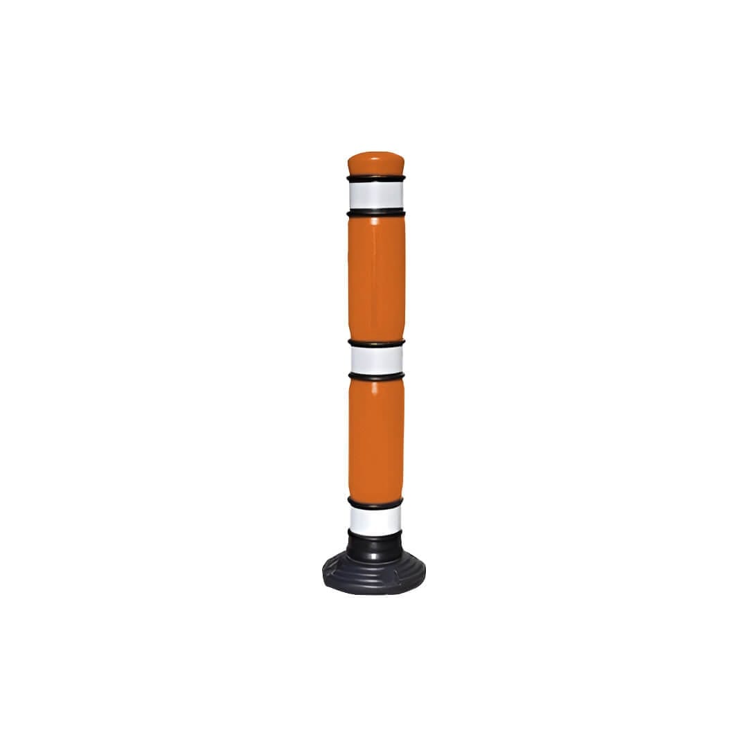 Fabricado de polietileno de alta densidad, con tratamiento para rayos U.V. Conformado por soporte, base módulo, módulo (poste), copete y anillos. Color: Naranja. Base Color: Negro. Se atornilla por la base al piso, con franjas de reflejante en los anillos de unión. Con reflejante prismático. Altura total 82.5 cm.