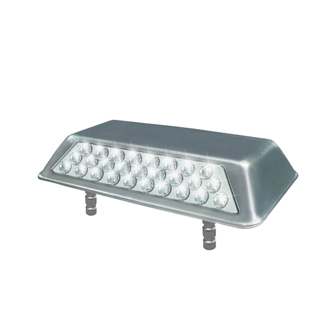 Descripción: Fabricado en acero inóxidable. Con tres lineas de 27 esferas reflejantes de 1.1 cm de diámetro. Su diseño obliga al alto total. Medidas: Largo: 23.5 cm. Alto: 4.5 cm. Ancho: 11.1cm. Reflejante en color Blanco. Incluye dos pernos de metal.