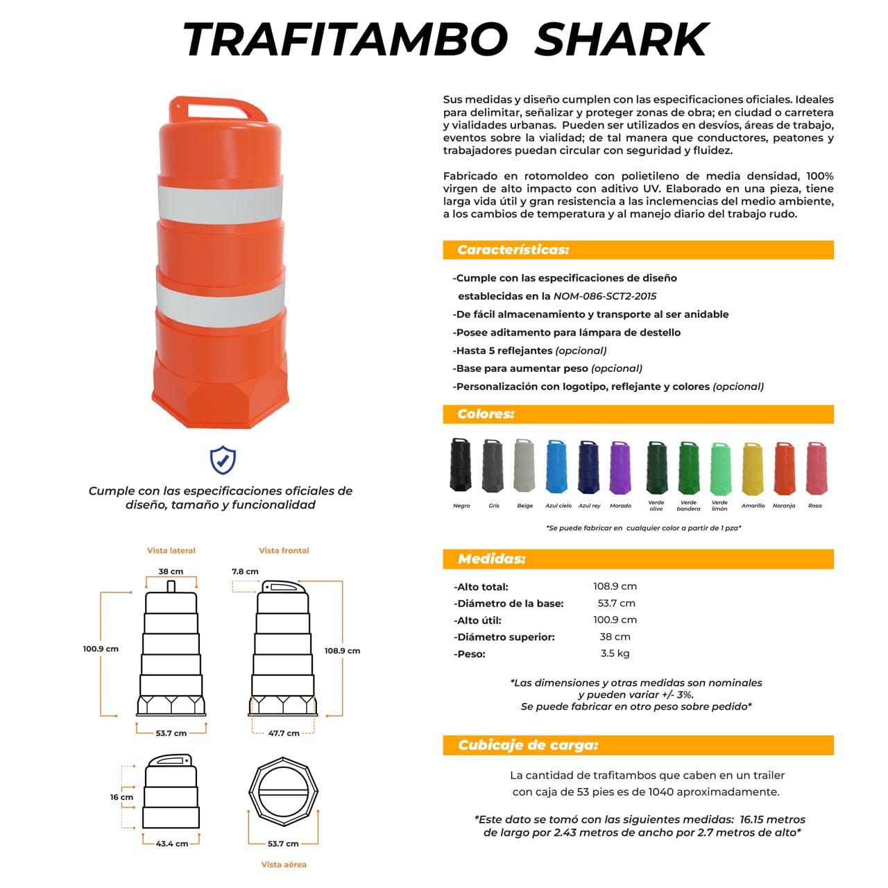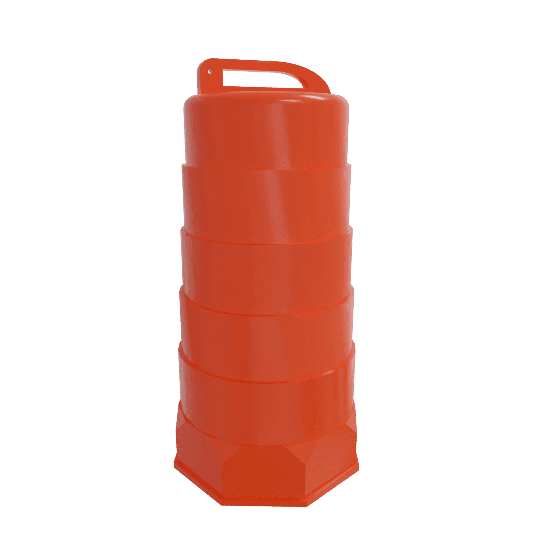 Descripción: Fabricado en polietileno de media densidad, 100% virgen y con aditivo U.V. Elaborado en una sola pieza, tiene larga vida útil y es de gran resistencia a las inclemencias del medio ambiente, a los cambios de temperatura y al manejo diario del trabajo rudo. Fácil manejo, gracias al asa que forma parte de la pieza, diseñada para la colocación de lámparas viales. De fácil almacenamiento y transporte al ser apilable. Sin reflejante. Color: Naranja. Medidas: Altura: 108.7 cm. Diámetro superior: 38.5 cm. Diámetro inferior: 53.7 cm. Peso: 3.5 Kg.